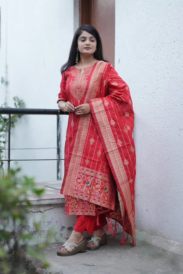 Festive Woven Gold Banarasi-Style Salwar Kameez Set in Red