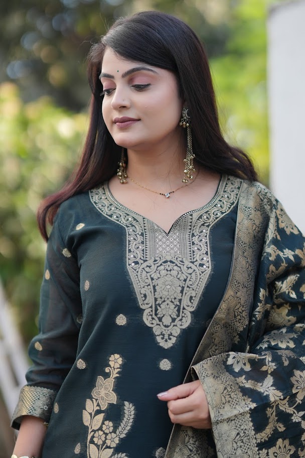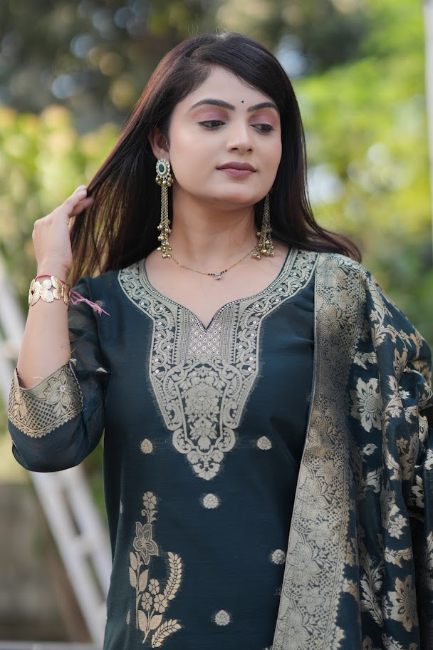 Elevate your festive and special occasion wardrobe with this stunning three-piece ethnic ensemble. Crafted in a rich, dark emerald green fabric with a subtle sheen, this ready-to-wear set features elaborate gold-toned (Zari) woven designs, including a prominent bodice pattern and matching motifs throughout the kurta and dupatta. Perfect for a sophisticated and traditional look.