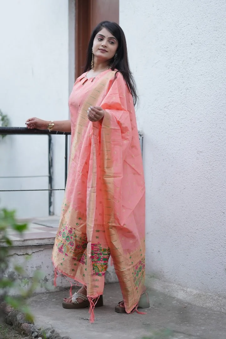 • Model Styling: As seen on the model, this set is beautifully paired with statement drop jhumka earrings and embellished block heels (heels not included).