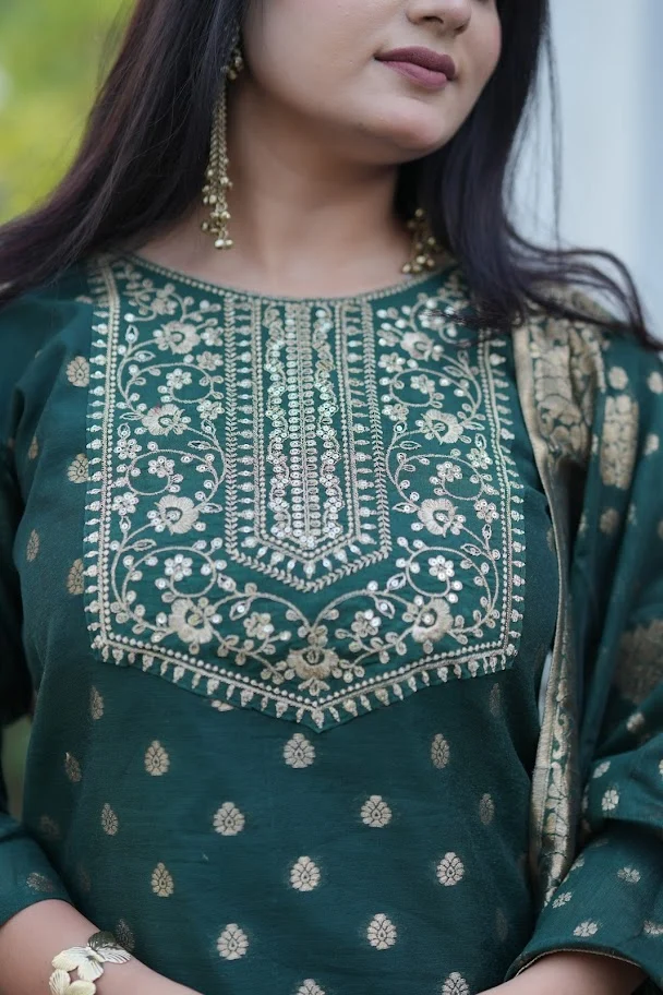 • Kurta: A straight-fit kurta in deep bottle green, highlighted by a heavily embroidered yoke. The bodice showcases intricate floral and geometric Zari embroidery, complemented by delicate gold foil-print buttis (motifs) across the body for a subtle shimmer.